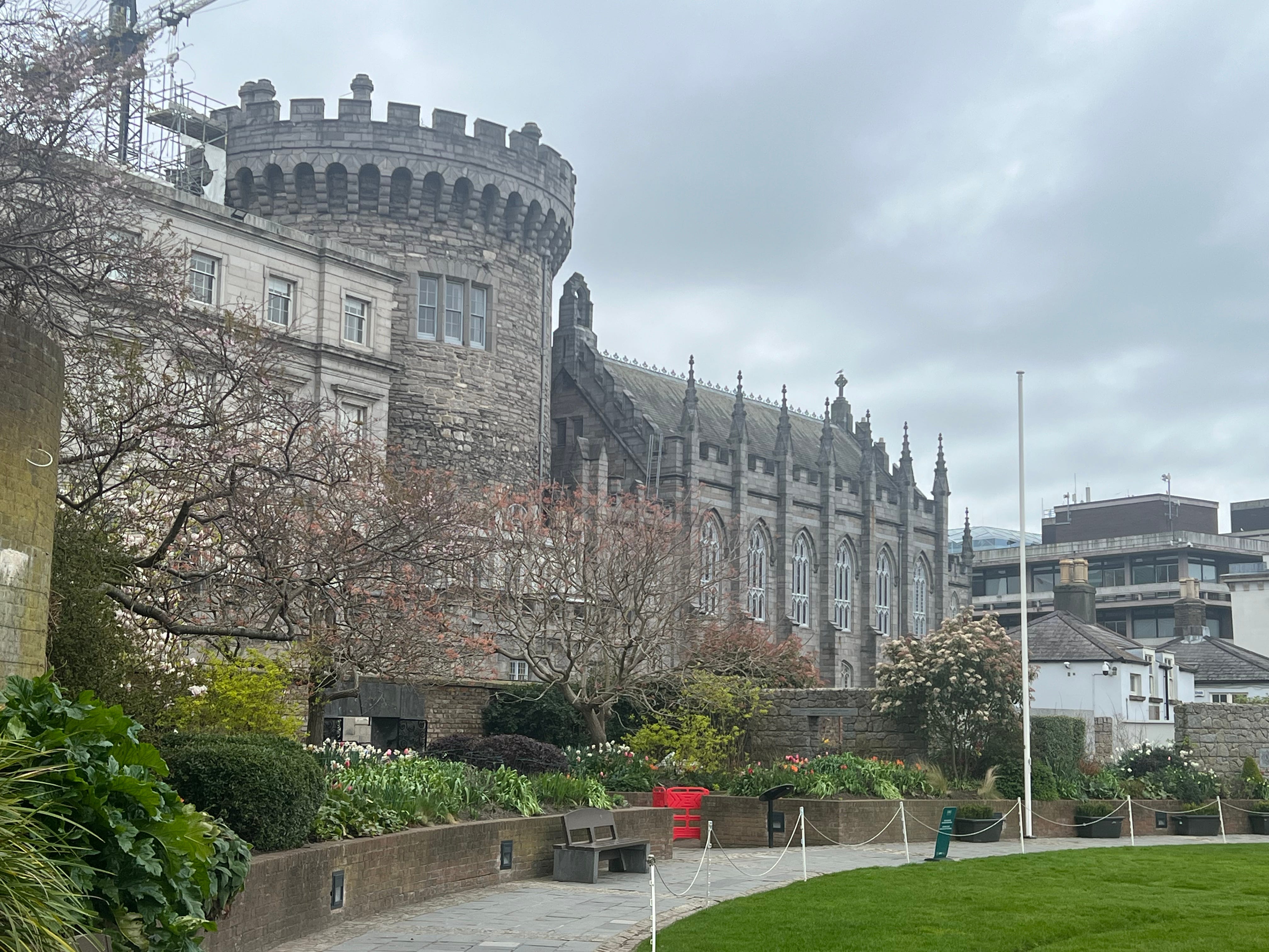 On our last day of travel, we visited Dublin Castle, which sits in “city centre,” smack in the middle of the capital city. It is one of the rare castles we saw intact and in use. For 700 years, from 1204 until Irish independence in 1921, it was the seat of English (and then British) rule in Ireland. It now serves the Republic of Ireland as a government complex and an arena of state ceremony.